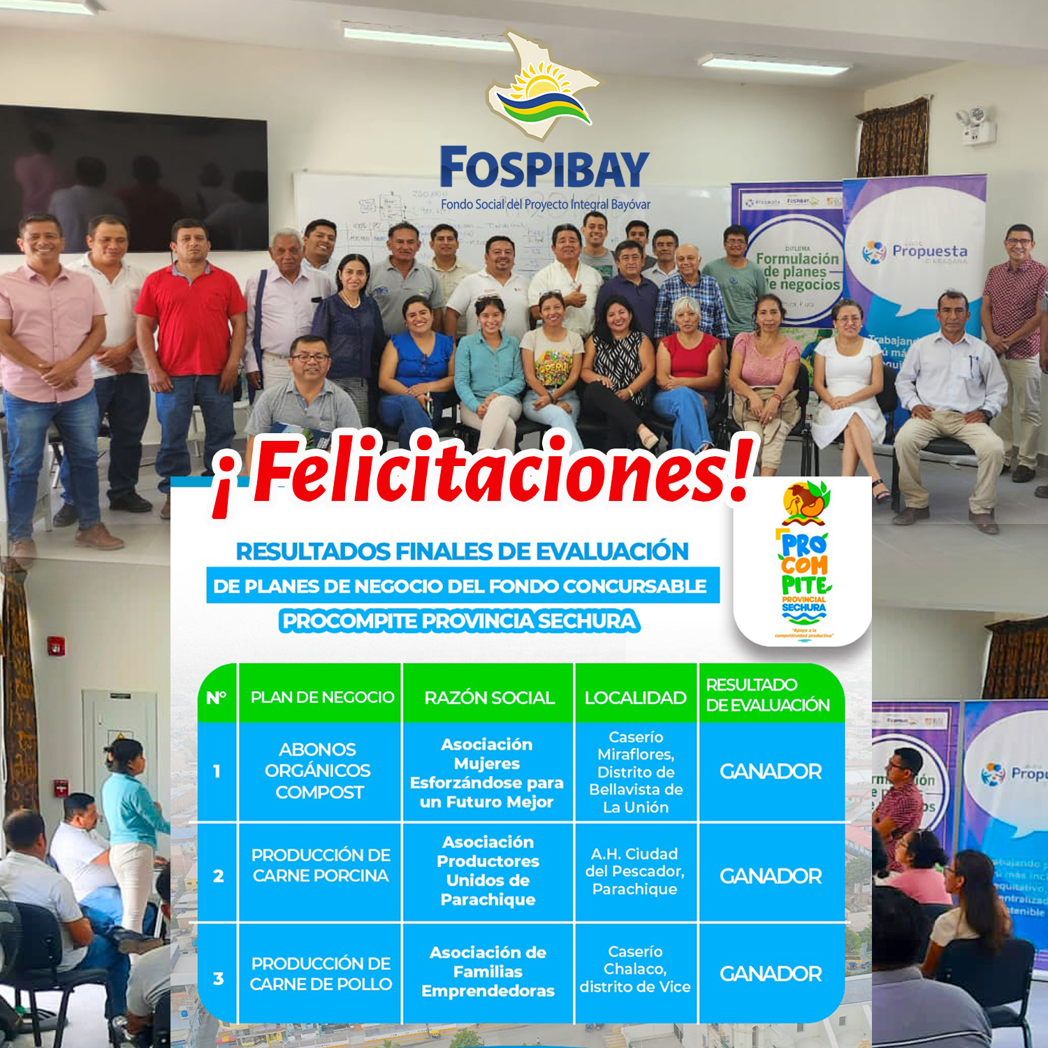 El Fondo Social del Proyecto Integral Bayóvar – FOSPIBAY, felicita a las asociaciones productivas ganadoras del Fondo Concursable PROCOMPITE 2024, cuyos formuladores participaron de nuestro Diploma “Formulación de Planes de Negocios”.