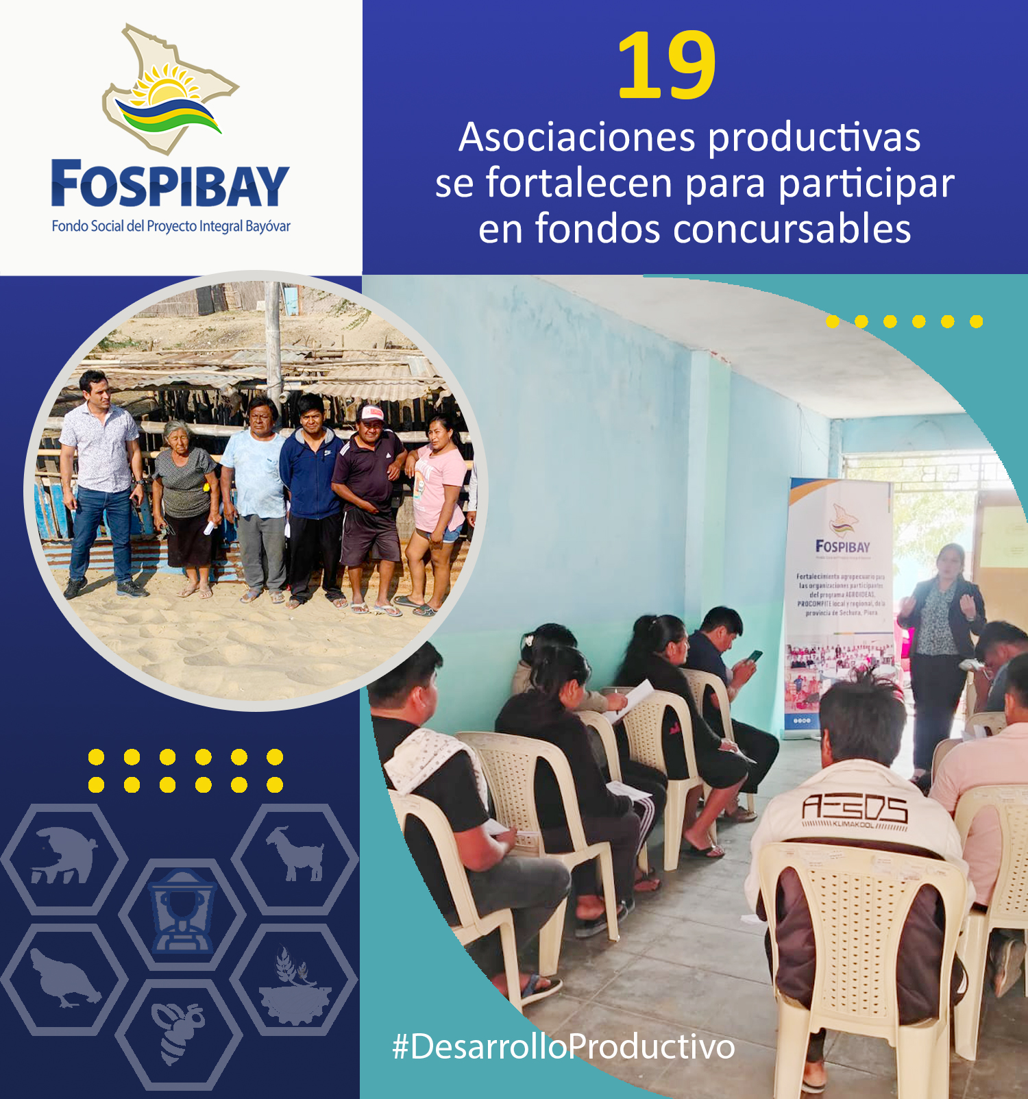 Este proyecto impulsado por el FOSPIBAY beneficia a más de 400 productores agropecuarios y está orientado a mejorar las capacidades productivas y comerciales de los participantes, para incrementar su rendimiento, producción y comercialización, mediante acompañamiento técnico y dotación de herramientas tecnológicas, así como el fortalecimiento institucional de sus organizaciones, de modo que se encuentren aptos a postular a programas concursables como AGROIDEAS y PROCOMPITE.