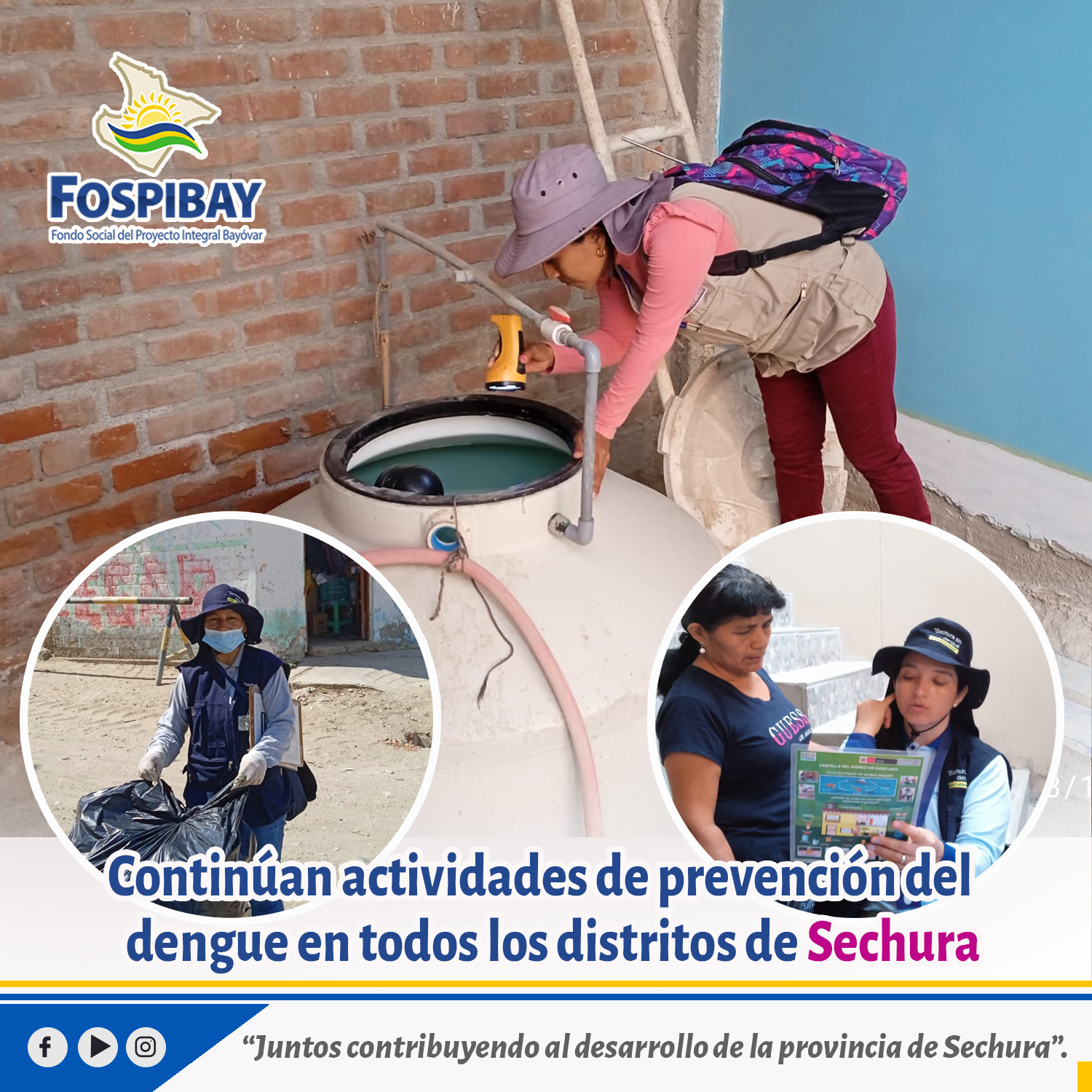 Ante el incremento de casos de dengue en la región, continúan las intervenciones del Plan de prevención entre el Establecimiento de Salud de Sechura, Municipalidad y FOSPIBAY, en ese sentido las brigadas de salud vienen realizando actividades de control vectorial y sensibilización en Sechura, Parachique, Vice, Bernal, Bellavista, Bernal, Becará, Letirá, Puerto Rico, Chusis, Tajamar, San cristo, San clemente y Cristo Nos Valga.