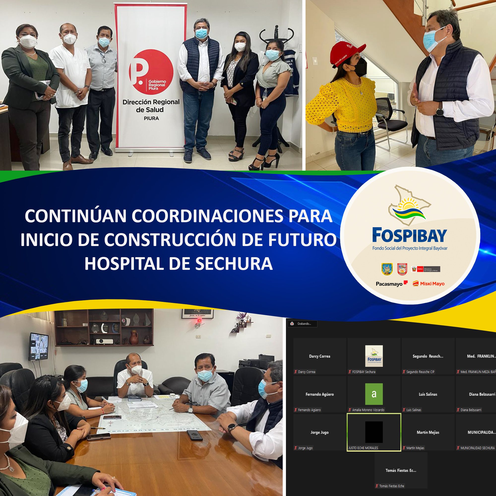 Con el alto compromiso del FOSPIBAY, Municipalidad provincial y consejería regional, continúa las coordinaciones para iniciar lo antes posible la ejecución del proyecto del Hospital de Sechura, por lo cual se vienen realizando reuniones concertadas con el director regional de Salud y la directora ejecutiva de la Autoridad de la Reconstrucción con Cambios a nivel nacional.