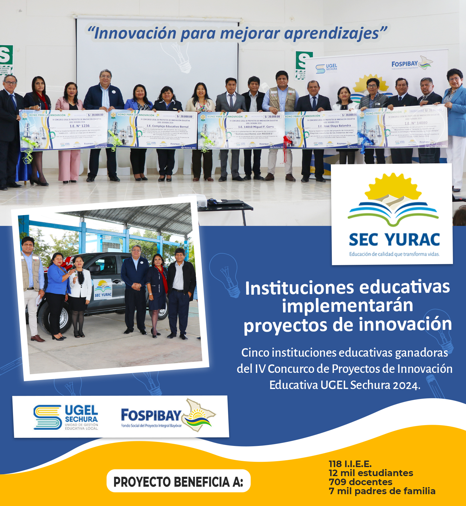 🔰En el marco del proyecto educativo “SEC YURAC” que se ejecuta en alianza estratégica entre el FOSPIBAY y UGEL Sechura, se realizó la ceremonia de premiación y reconocimiento al esfuerzo de las cinco instituciones ganadoras del IV Concurso de Innovación Educativa UGEL Sechura 2024, quienes podrán implementar su proyecto innovador en su institución educativa.