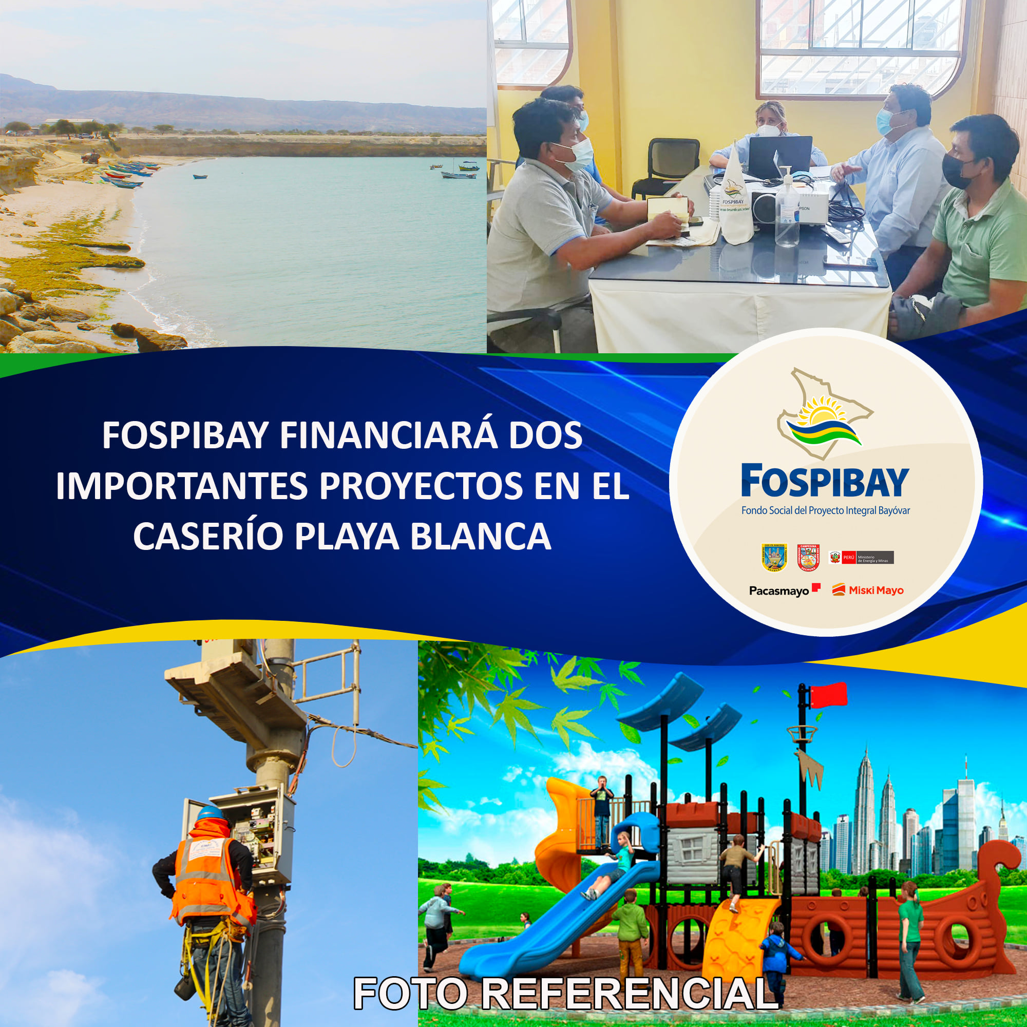 Moradores del caserío Playa Blanca se reunieron con el Ing. Segundo Reusche, gerente del FOSPIBAY, para conocer el avance de los proyectos que serán ejecutados y financiados por el Fondo Social. Durante la reunión, el equipo técnico del FOSPIBAY dio a conocer que ambos proyectos se encuentran en proceso de convocatoria para la elaboración del expediente técnico. Cabe indicar que los proyectos que se ejecutarán en este importante caserío son: “Creación del servicio de recreación activa y esparcimiento para el desarrollo psicomotriz en infantes y niños de Playa Blanca y Puerto Rico del distrito de Sechura” e “Instalación del servicio de energía eléctrica mediante sistema convencional en el caserío Playa Blanca”.