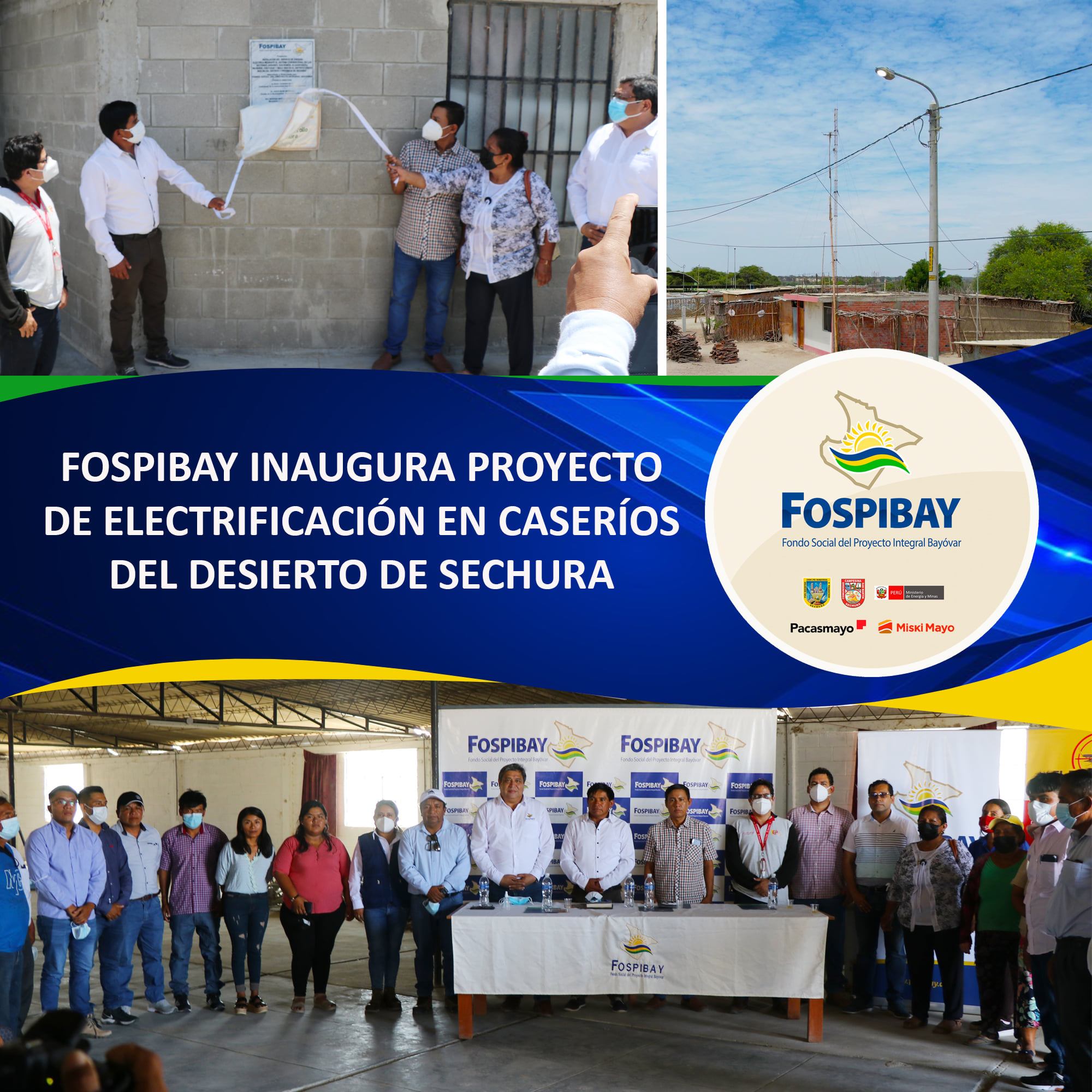 Con la participación de la población, autoridades locales, miembros del Consejo Directivo y equipo técnico del FOSPIBAY se realizó la inauguración y entrega oficial del proyecto: “Instalación del servicio de energía eléctrica mediante el sistema convencional en los sectores Jardines, San Ramón, Algarrobera, Valverde, Chutuque y Mala Vida, Distrito de Cristo Nos Valga, provincia de Sechura”, proyecto financiado por el FOSPIBAY con una inversión de S/ 901,916.42 que incluye ejecución y supervisión.