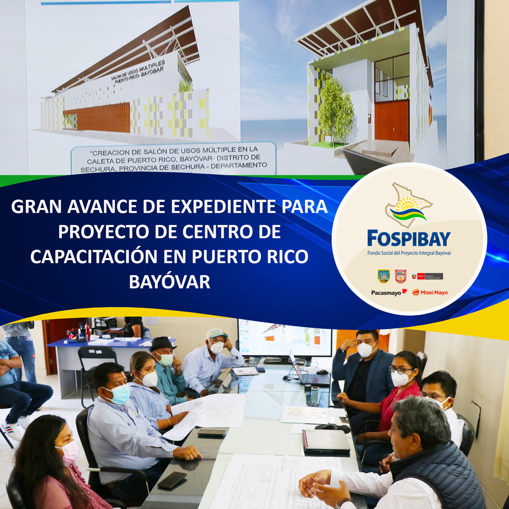 El expediente técnico del proyecto del “Centro de Capacitación y adiestramiento – salón de usos múltiples de Caleta Puerto Rico. Bayóvar”, cuya elaboración realiza el municipio provincial, está próximo a ser concluido para su aprobación y ejecución, así lo manifestó el equipo técnico de la municipalidad de Sechura en reunión sostenida con el equipo técnico del FOSPIBAY y representantes de la población de Puerto Rico Bayóvar.