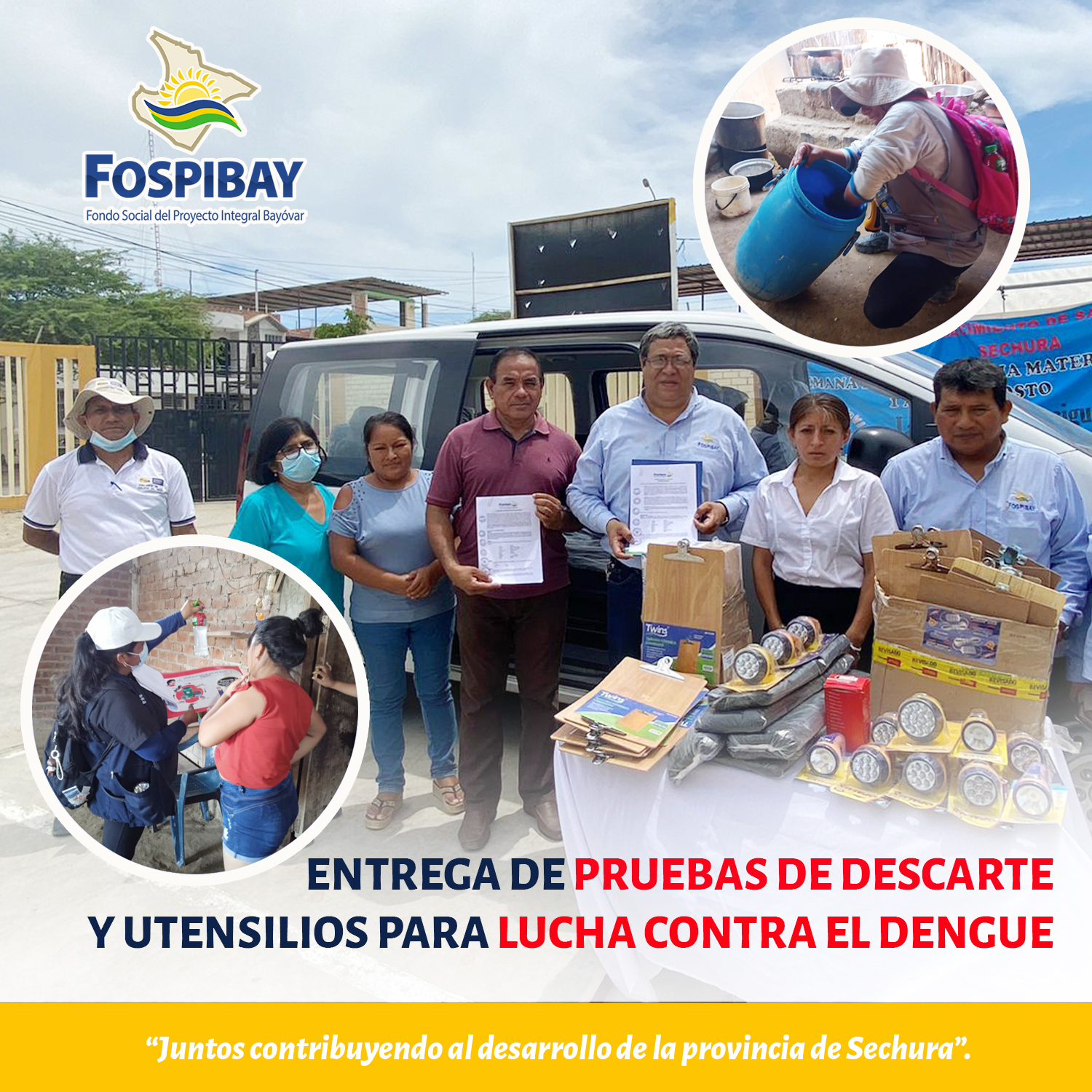 Continuando con las acciones para la lucha contra el dengue en la provincia de Sechura, en el marco del Plan de intervención entre el Fospibay y Clas Sechura, se realizó la entrega de 200 pruebas de descarte contra el dengue que permitirá identificar rápidamente los casos positivos y proceder con los cercos epidemiológicos evitando los casos masivos en la provincia.