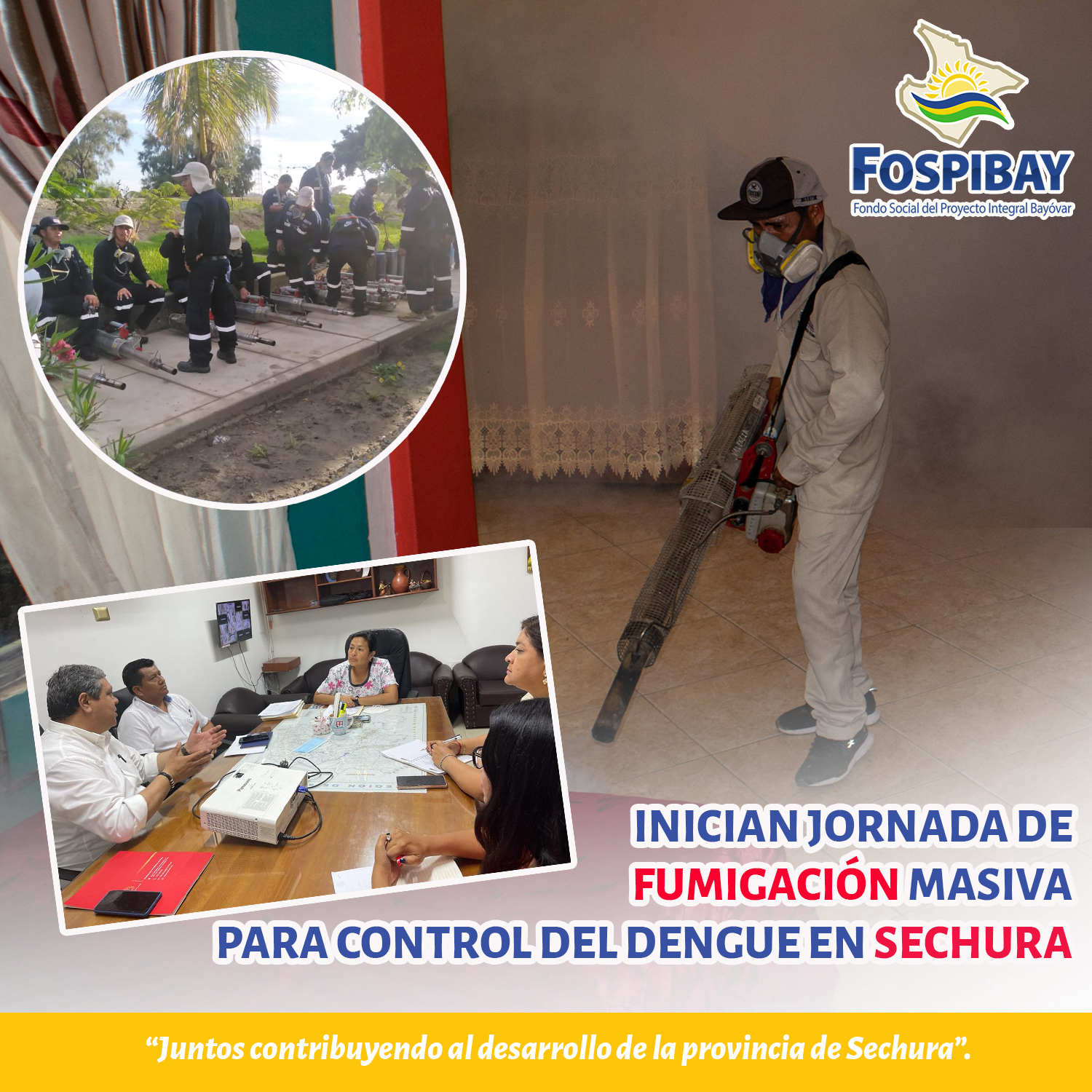 Dicha jornada se realiza en articulación entre el FOSPIBAY, DIRESA y Municipalidad provincial de Sechura, quienes han realizado coordinaciones previas para cubrir la logística y personal. Esta jornada consiste en el despliegue de más de 50 fumigadores además de personal de apoyo que realizarán la intervención en el 100% de las viviendas, que serán fumigadas hasta en tres oportunidades como estrategia de lograr los mejores resultados en la eliminación del vector en su etapa adulta, por lo que se pide a la población continuar prestando las facilidades correspondientes.