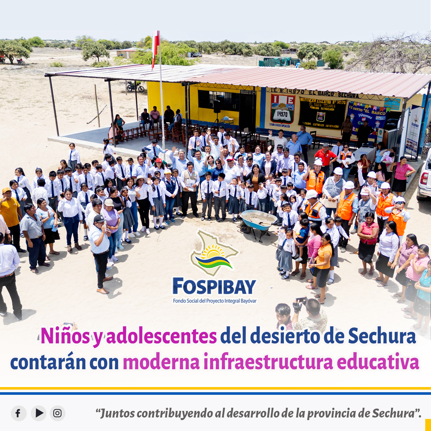 🔰Este proyecto cuya unidad formuladora es el municipio provincial de Sechura, que ha estado a cargo del respectivo expediente técnico, será financiado por el FOSPIBAY con un monto aprobado de 6 millones 698 mil 934 soles con un plazo de ejecución de ocho meses (240 días calendario) y comprende la construcción de ocho aulas para el nivel primaria y secundaria, biblioteca, aula de innovación pedagógica, salón de usos múltiples, cocina, servicios higiénicos, sala de profesores, dirección, cuarto de limpieza, laboratorios, tópico, residencia docente, equipos de sistema de energía solar, grupo electrógeno, cerco perimétrico, portadas de ingreso, patio, cerco de malla metálica, cisterna, tanque elevado, veredas de concreto, evacuación pluvial, entre otros.
