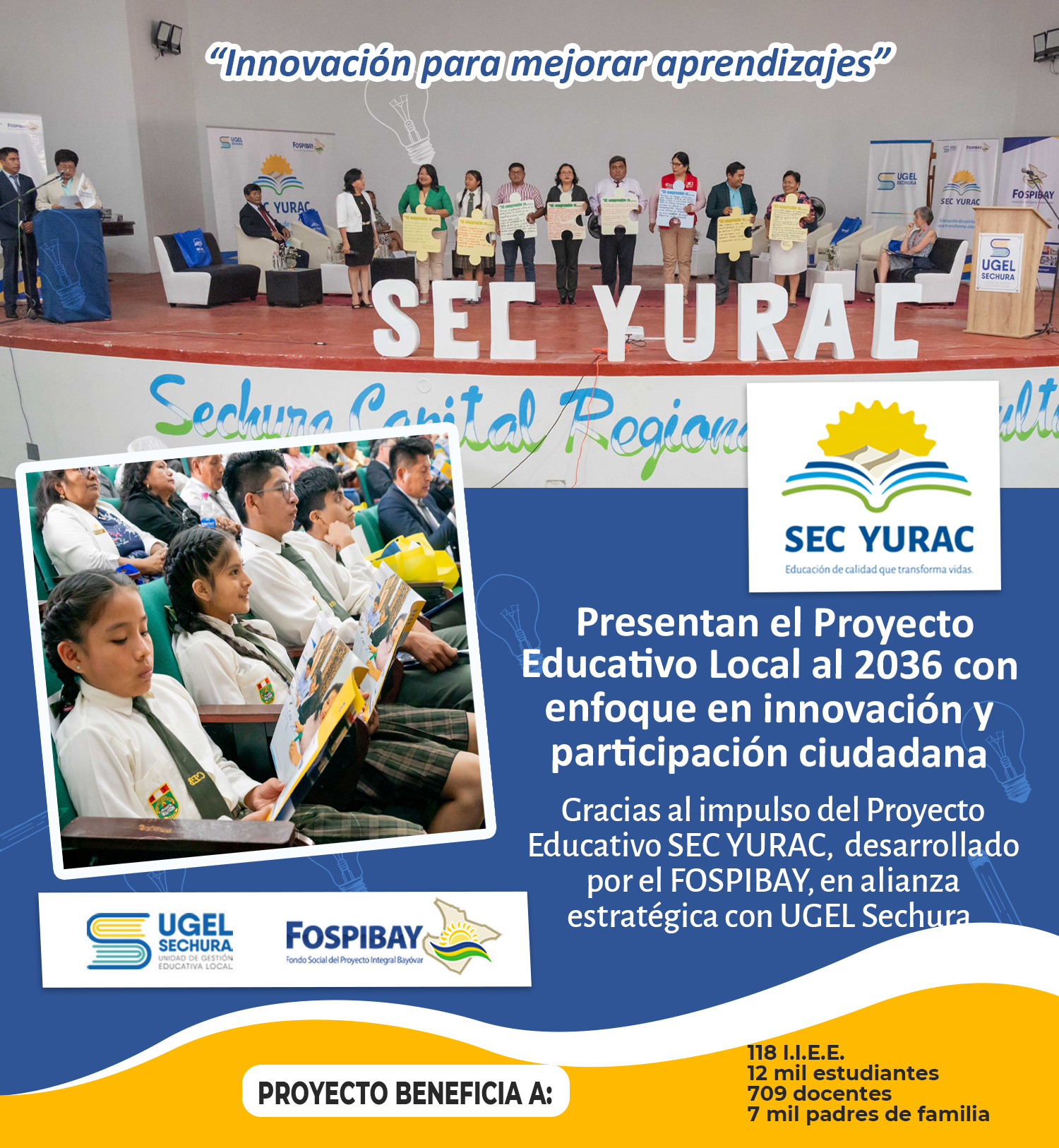 🚀📚La Unidad de Gestión Educativa Local (UGEL) Sechura, presentó oficialmente el Proyecto Educativo Local (PEL) al 2036, el mismo que busca transformar la educación en la provincia, fomentando la innovación educativa y el desarrollo social inclusivo. El PEL ha sido impulsado por el Proyecto Educativo SEC YURAC, desarrollado por el Fondo Social del Proyecto Integral Bayóvar (FOSPIBAY), en alianza estratégica con UGEL Sechura.