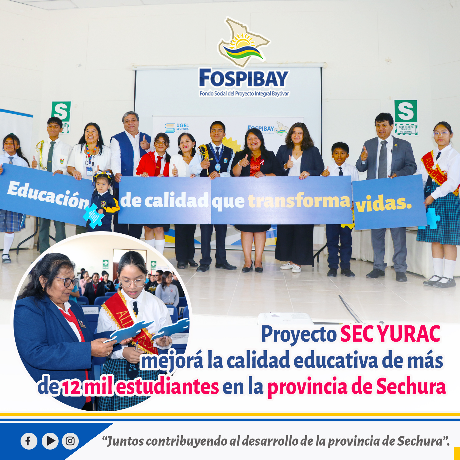 En una importante ceremonia, se dio inicio al proyecto educativo SEC YURAC, una iniciativa del Fondo Social del Proyecto Integral Bayóvar (FOSPIBAY) y la Unidad de Gestión Educativa Local (UGEL) Sechura, que beneficiará a 12 095 estudiantes de Sechura, quienes recibirán un servicio educativo de calidad que les permitirá potenciar el desarrollo integral de sus competencias.